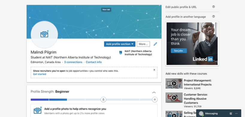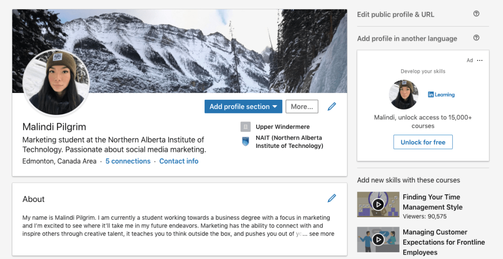 Creating a LinkedIn profile is easy! Follow the simple steps that LinkedIn takes you through, such as entering your email, creating a password, and including your name. Make sure to include that you are a student, which post-secondary school you currently attend, and when you’ll be graduating. Be sure to include any degrees you may have and your field of study. You can also include clubs, sports, or extracurricular activities you may have been a part of! Having a picture is crucial for your LinkedIn profile because it gives others a way to identify you and you are guaranteed far more views than accounts without one (Schinkten, 2018). It’s important you upload a professional image of yourself, so people can see and recognize your face. You can even upload a customized background picture, and this will make your account stand out! Your profile picture and background are one of the first few things people will see on your LinkedIn account. Get creative and be professional!