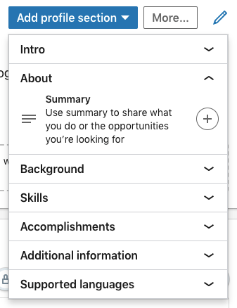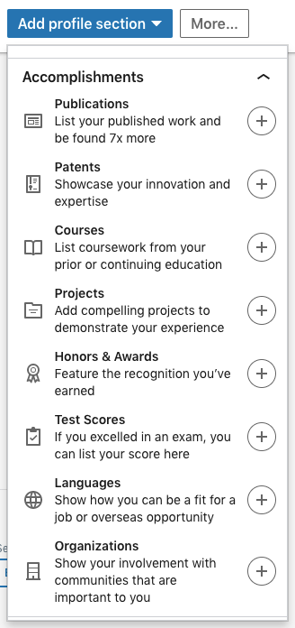 You can also add new sections to your LinkedIn profile, but make sure you choose wisely! You want them to “add value to your profile” (Schinkten, 2018). Here are examples of profile sections you can add to your account; all you have to do is click on the plus sign!