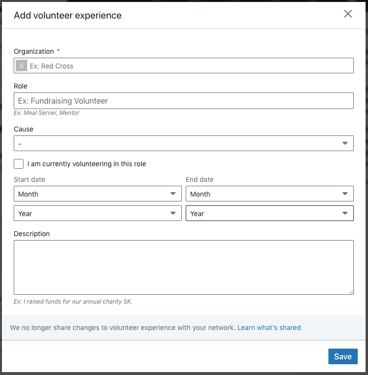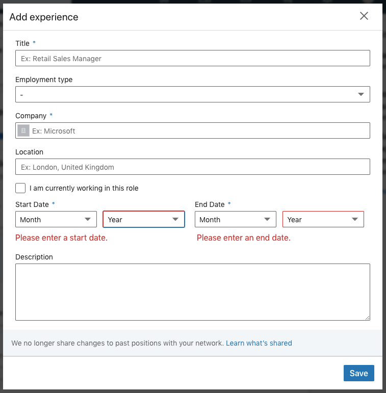 Having a LinkedIn account allows you to enter in work experience and volunteer experience you’ve had. You must list these on your profile, so people get an idea about what you’ve done! The nice thing about LinkedIn is that it will give you a template of everything you need to include, as shown below!