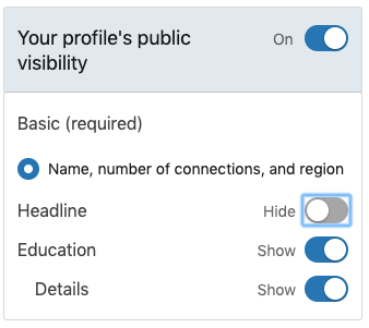 Woohoo! You now have a LinkedIn account, but that’s not all. Let’s take a look at “how to configure our public profile” (Schinkten, 2018). This means that you can edit the visibility of your account to “public” or “private” for people who aren’t members of LinkedIn. For example, if you have an Instagram account, you can change your account to “public” that way everyone can see what you post without having to request a follow, or you can change your account to “private” in which you can accept someone’s “follow request” for them to see what you post. LinkedIn is a little bit more flexible than that; you get to choose what people can and cannot see! If you have a public account, you can hide certain aspects of your profile such as your headline. Viewers without LinkedIn will be able to see your profile, except for the things you’ve hidden until you connect with them. Check out the example I’ve provided down below!