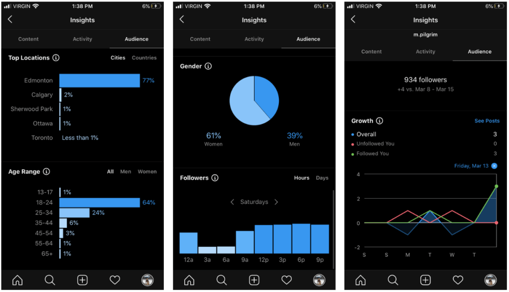 Instagram insights provide you will valuable information such as your reach, impressions, and how many people have visited your profile in the past week. Instagram provides you with the location of your followers, and as you can see a vast majority of my followers are local (Edmonton). These insights also provide you with the age of your followers and their gender; 64% of my followers are between the ages of 18-24 and 61% of my followers are female. This is valuable information for any business because you generate an understanding of your followers allowing you to create content geared towards them! One last important aspect of the metrics that Instagram provides you with is a graph. This graph is a measure of your growth in regard to your followers; how many you gained and how many you lost over ‘x’ days. I hope you found this helpful and were able to gain a little bit more insight on how to increase your social media ROI.